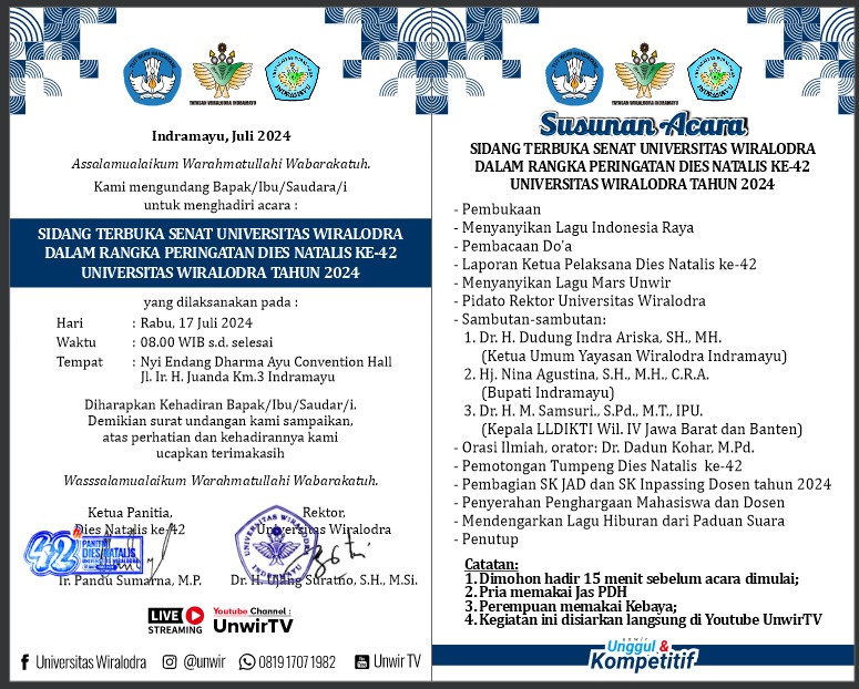 Pada hari Kamis ini, tanggal 17 Juli 2024, Universitas Wiralodra merayakan ulang tahun yang ke-42. Serangkaian acara dan kegiatan telah disusun oleh Panitia Dies Natalis XLII dalam rangka memeriahkan ulang tahun tersebut, dimulai dengan acara Sidang Terbuka Senat Universitas Wiralodra dalam Rangka Peringatan Dies Natalis ke-42 Univesitas Wiralodra Tahun 2024, sebagaimana tercantum pada gambar di bawah ini.