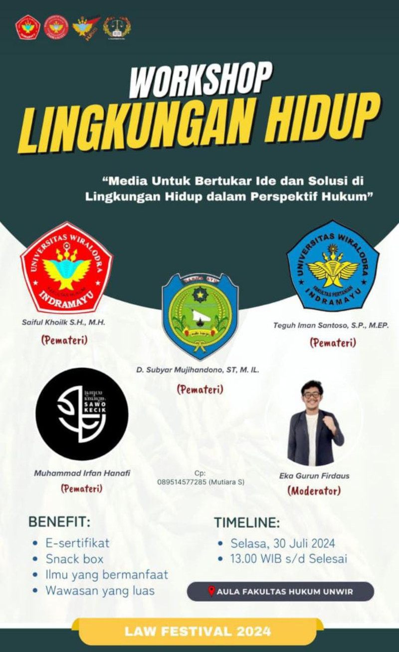 Selasa, 30 Juli 2024. BEM Fakultas Hukum menggelar Acara Law Fest Tahun 2024, bertemakan "Bersatu Dalam Seni dan Akademik (BERSEMI)". Dalam rangkaian acara tersebut diselenggarakan pula Workshop Pengelolaan Limbah Padi dan Perspektif Hukum Dalam Lingkungan Hidup dengan tema "Media untuk bertukar Ide dan Solusi Lingkungan Hidup dalam Perspektif Hukum" bertempat di Aula Fakultas Hukum Universitas Wiralodra.
